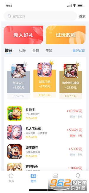 游戏:游戏页面主要用于对APP中的游戏进行分类展示,本页面中的游戏分为推荐、快赚、益智、手游、其他。用户也能在这个页面查看自己最近试玩的游戏以及新人好礼和试玩教程。