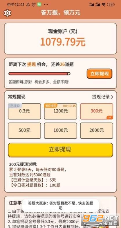 如图中所示,累计登录5天,每天答对80道题,且答对数达到5000道题,即可成功兑现300元。