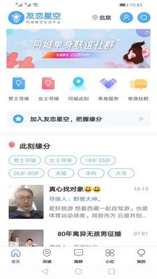 友恋星空网是互联网单身人群交友征婚领先互动平台。友恋星空以快乐分享 健康互动为产品理念,通过分享交流、分享信息、分享生活的产品特征,充分满足用户日益增长的网络需求和多元化的网络体验,致力于服务快速社会生活中的单身人群,以用户需求为导向,稳健向前发展。