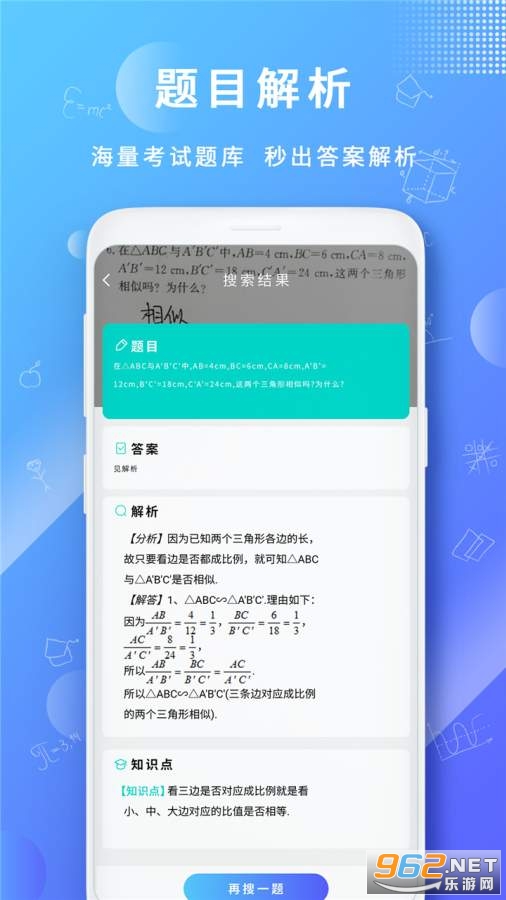 《题拍一拍安卓版》是一款为朋友们打造的拍照搜答案的学习软件,学生在家里做作业的时候遇到不会的可以使用本款软件来进行搜题,操作非常的简单,直接打开软件然后拍摄不会的题目即可,软件中会显示出题目的详细解题过程,数学、语文、英语等各种学科都可以用。