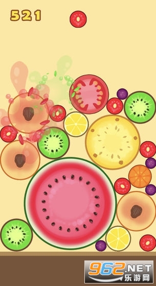 相同的水果互相解除后会变成更大的一种新水果(类似2048),而最大的水果就是“大西瓜”了(因此游戏名叫合成大西瓜);