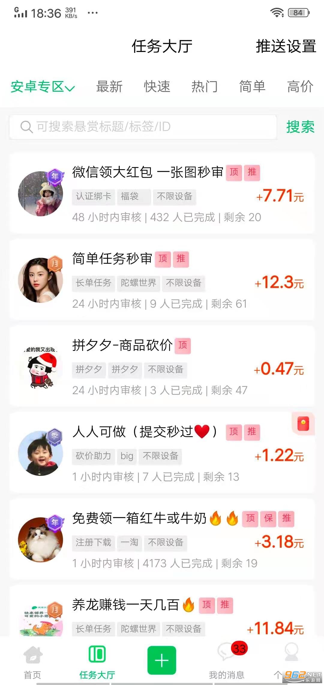 2、软件上提供了海量悬赏任务,简单操作就能挣赏金,单价1-10元/次,支持发布;