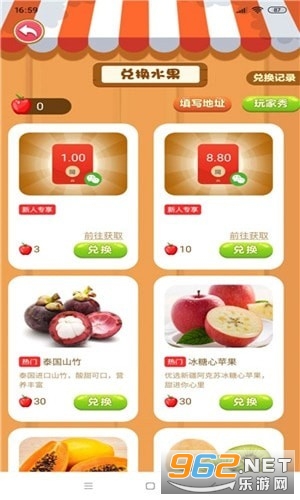 3、玩家上线即可领取新人福利,每天上线签到、收集水滴,浇灌数目,产生苹果,兑换红包奖励。