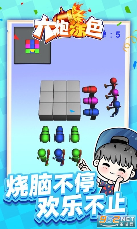 在这款游戏中,玩家可以通过发射彩色大炮,将砖块染色到目标颜色,即可顺利通关。