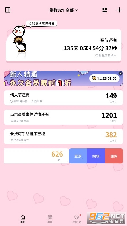 《倒数321》是一款少女心炸裂的神仙软件,通过这款软件能够实时提醒你各种各样重要日子,你和他在一起多少天了,距离各种节日、生日还有多少天,正数倒数的日子提示,让你记住每一个重要事件,同时软件的整体画面非常可爱,赶快下载体验吧!