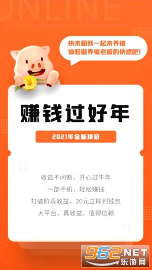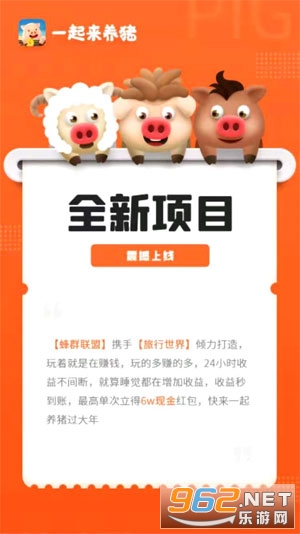 一起来养猪由蜂群联盟携手旅行世界倾力打造,玩着就是在赚钱,玩的多赚的多,24小时收益不间断,就算睡觉都在增加收益,收益秒到账,最高单次立得6万现金红包,快来一起养猪过大年。