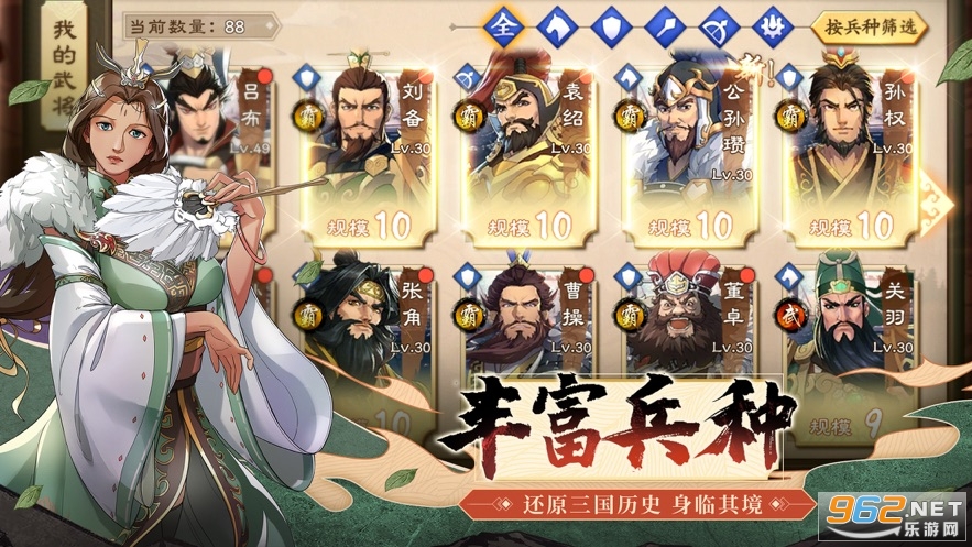海量的搭配,构筑不一样的阵容。丰富兵种,骑兵、枪兵、弓兵、戟兵、井阑、投石车、冲车。多种武将类型,霸者、儒将、武将、军师、谋士、侍郎。丰富的兵法、策略、特技、宝物,变化多端。