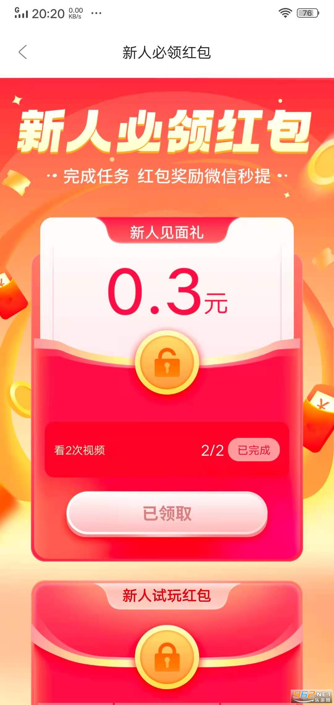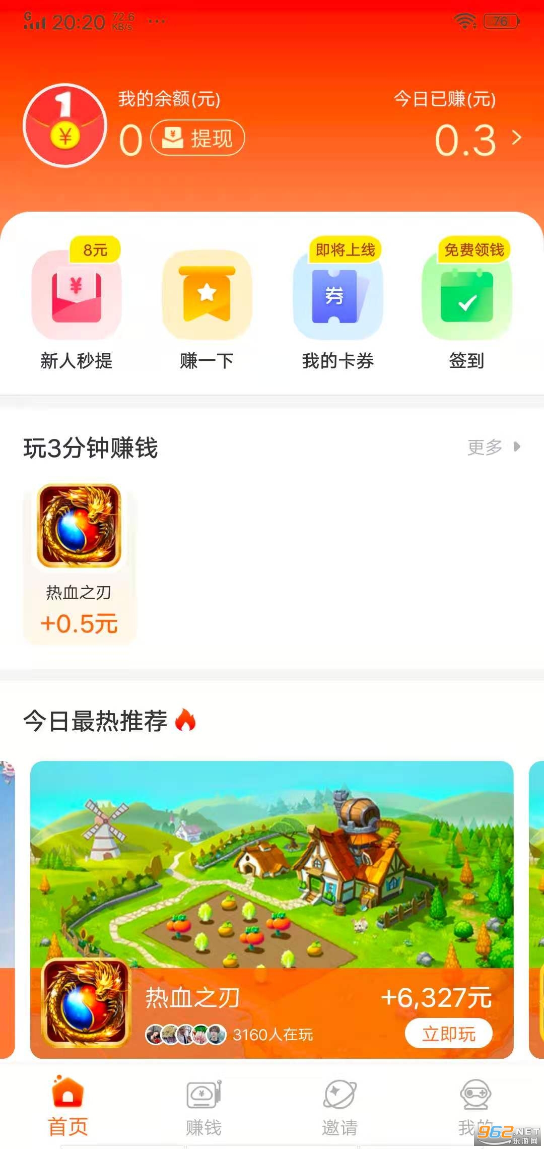 1、一款安全可靠的安卓手机赚钱软件,玩游戏赚现金,新人加入观看2个视频秒到账0.3元;
