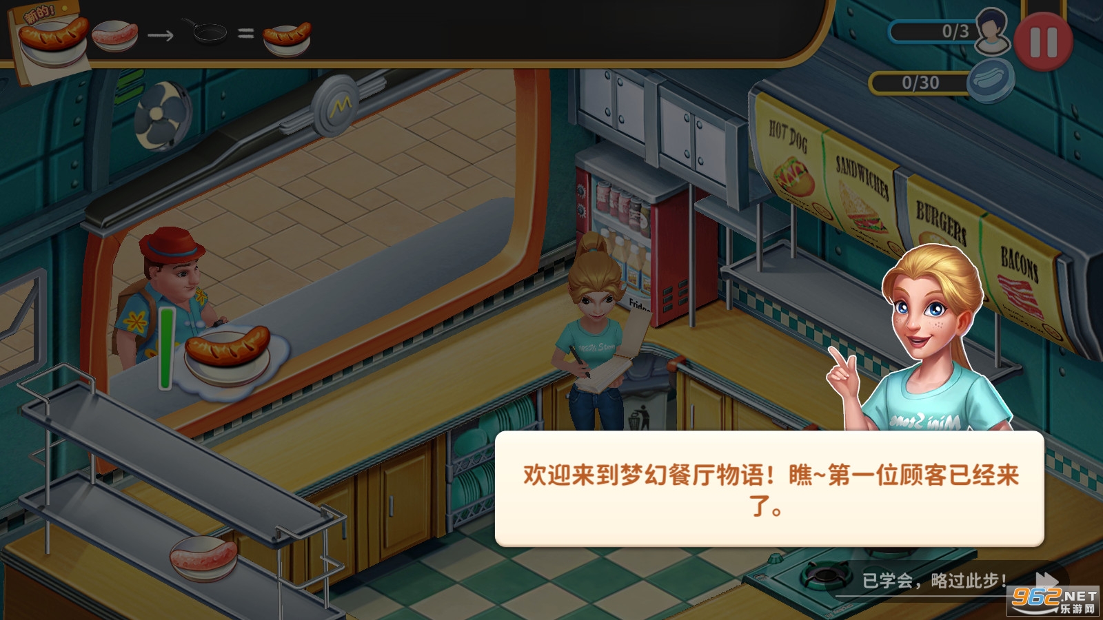玩法简单,极易上手。顾客所点定订均有详细菜谱展示制作步骤,根据菜谱点击控制厨师制作食物。