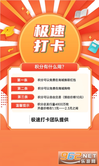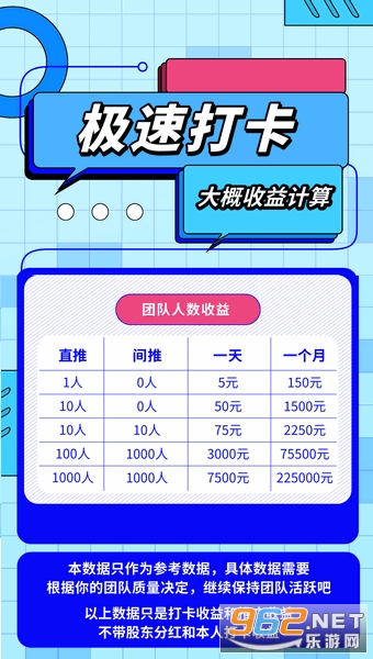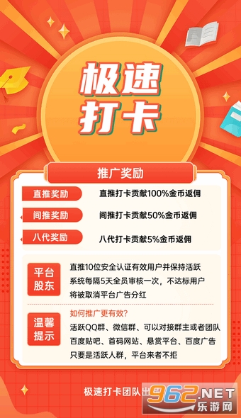 在极速打卡红包版中每人每天可以打卡10次(看10次广告)打卡一次0.5金币+0.2积分,极速打卡赚软件静态收益一天5金币+2积分,1金币等于1元,后期极速打卡app里一个积分预估10元,推广收益无上限,直推打卡贡献100%,间推打卡50%,金币奖励在极速打卡赚钱软件的兑换界面进行兑换。