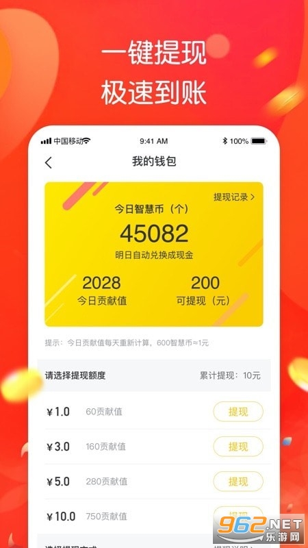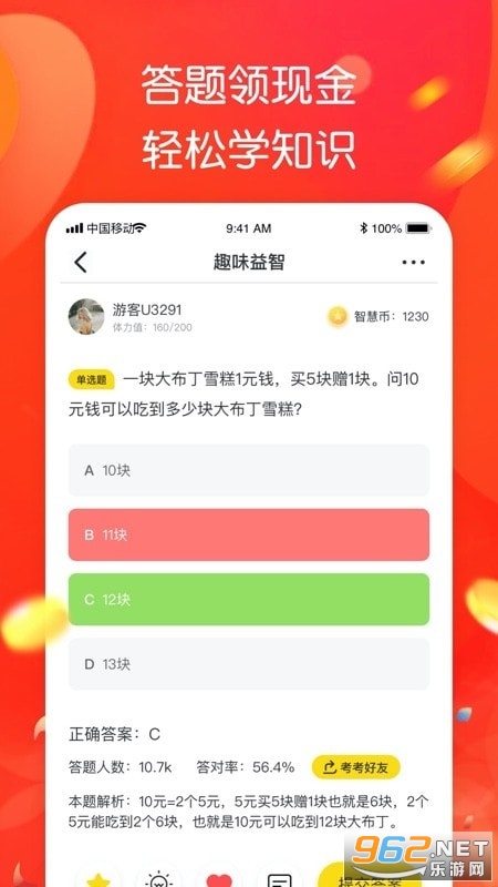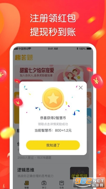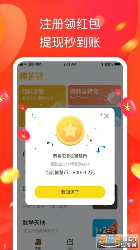 《智趣答题领红包》是一款能赚钱的手机答题赚钱游戏,简单的游戏玩法,轻松的游戏体验,不但可以打发无聊的时间,还能通过玩游戏来赚红包福利,感兴趣的小伙伴快来下载吧!