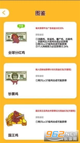 一款趣味小鸡养成游戏,在这里你将拥有一间养鸡场,可以养育各种有趣的小鸡,而小鸡也会为你带来收益,两只相同等级的小鸡可以合成更高等级的鸡哦,每一次合成对于新生成的鸡都是非常期待的,把小鸡养到最高等级就能够换取不多的红包收益了!
