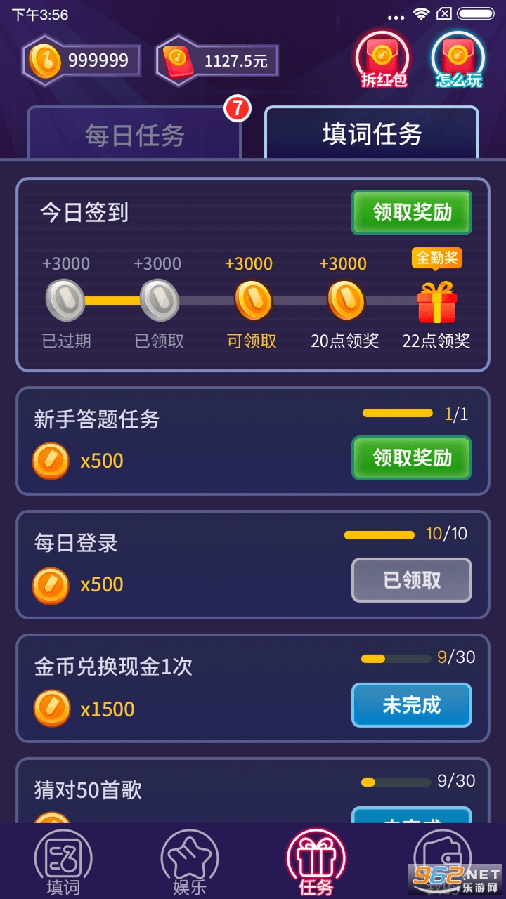 3、任务多多,每天定时更新,还能通过签到领取金币奖励;
