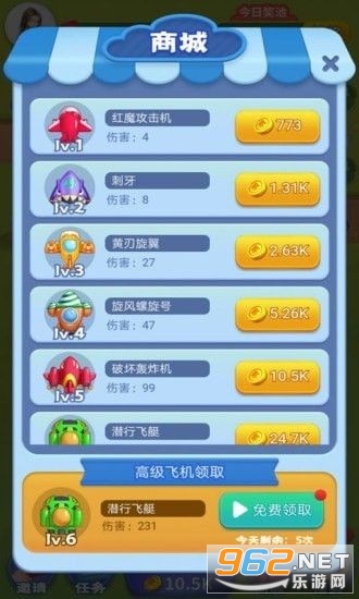 3、获取游戏的金币解锁更多不同技能的飞机使用这些飞机进行挑战,玩法充满无限的挑战。