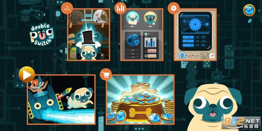 《双切巴哥犬 Double Pug Switch》是一款较为硬核的横版跳跃闯关游戏,采用哈巴狗为游戏主角,你可以控制一个哈巴狗在这个末日般的实验室里面上蹿下跳,躲避沿途的陷阱与敌人,手机游戏中的金币,获得游戏的高分。运行,跳跃,通电和哭你的方式通过几个级别的狗维度善