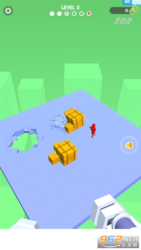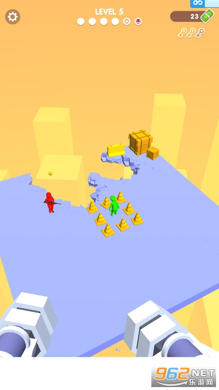 1、在场景中会有很多的敌人,同时也有被绑架的人质,你需要将地板破坏,让敌人跌倒,同时别忘了挽救被绑架的无辜人民;