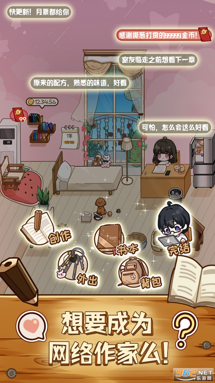 《小说家模拟2游戏》是一款画面清新的模拟当小说家的趣味休闲手游,游戏中玩家将扮演一个小说家,你的任务就是按时的进行更新,写出各种受欢迎的小说,注意不要拖更,会影响粉丝数量,不断的创新,提高自己粉丝量,增加收入。