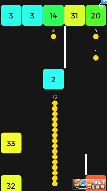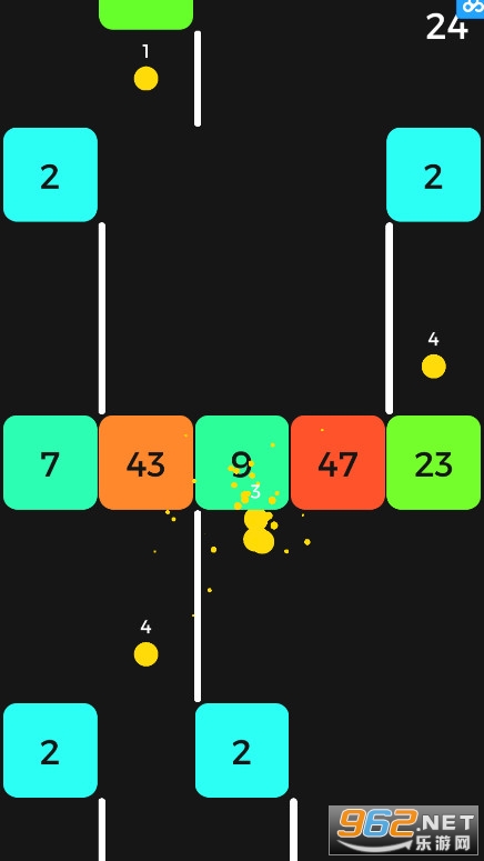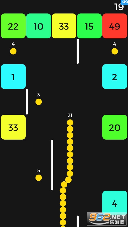 游戏画面由黄色小球和若干富有质感的彩色方块组成,玩家需要操作扭动前行的黄色「长条」——蛇,尽可能吃掉足够多的豆豆,因为标有数字的彩色方块会强行收“过路费”——消耗你的豆豆养料。