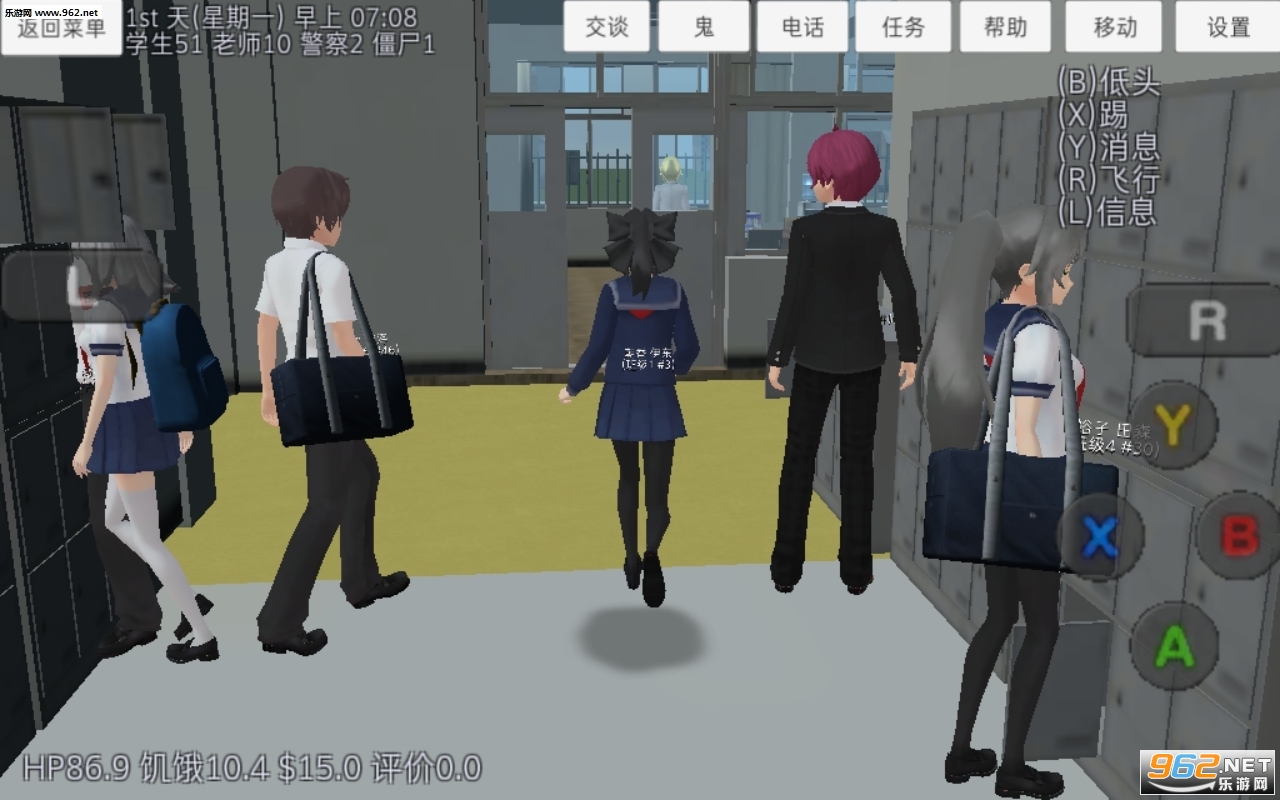 玩法:很普通的玩法,无僵尸模式,照着课表上课,吃东西,上社团活动,加入或退出社团,和学生老师互动,攻略学生并和学生恋爱,爬山玩水,開車,等...... .。