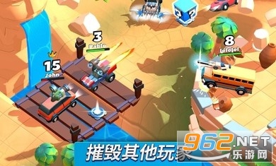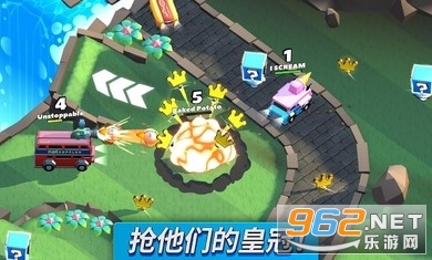 游戏的玩法十分简单,目前一共有月球表面、沙漠地带、狭窄小道和陡峭峡谷四大场景可供你进行挑战。它们各具特色,能够给你带来不同的体验效果,同时也通过不同的画风渲染,在肯定程度上减轻了你的视觉疲劳。在与其他玩家“互相伤害”的时候,你除了需要尽可能多的收集皇冠之外,还需巧妙的借助场景里面的各式道具,保护好自己并攻击摧毁其他玩家才行。其中,这些道具具有护盾、加速、喷火器和发射炮弹等效果,玩起来也是相当的刺激。