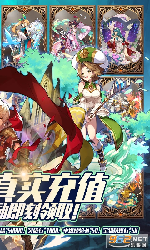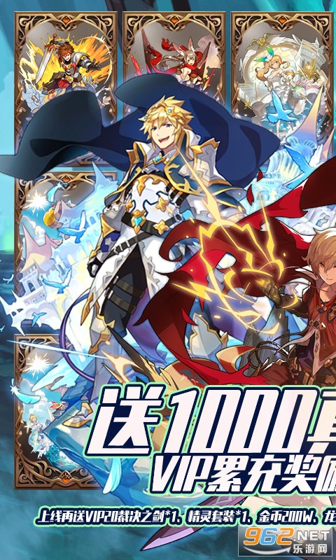 ★充值卡*1000元、VIP20、精灵套装*1、金币100W、突破石*500、中级经验书*50、宝物精炼石*50