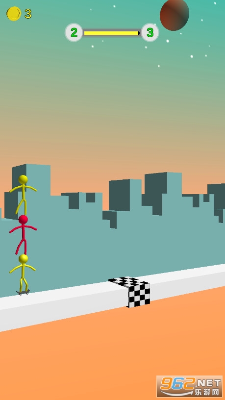 《火柴人堆叠大赛安卓游戏》是一款有趣的跑酷敏捷堆叠闯关游戏,你的火柴人会踩着滑板在轨道上滑动,你要让你的火柴人跳起来,躲避障碍,或者是踩到变色段,让火柴人变色,然后跳起来去堆叠其他的火柴人,一直坚持到终点。
