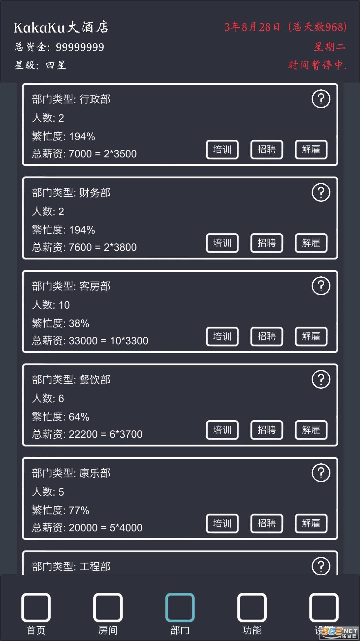 游戏中玩家需要扮演一名老板的角色,为了酒店的壮大与发展,您需要决策酒店的发展制度,什么时候做什么事,还需要安抚员工的不满情绪,等等之类的~~~~最终你能否发展为世界第一大酒店呢(七星)??我们拭目以待吧!