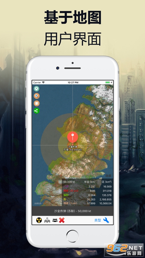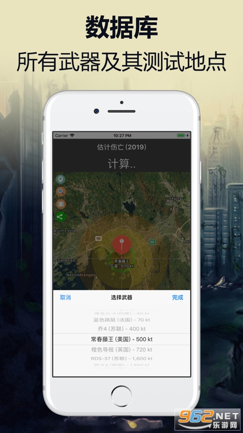 此应用程序可用于试验热辐射范围,无线电主动辐射半径和可能的伤亡人数。 它包括人类历史上流行的武器清单。