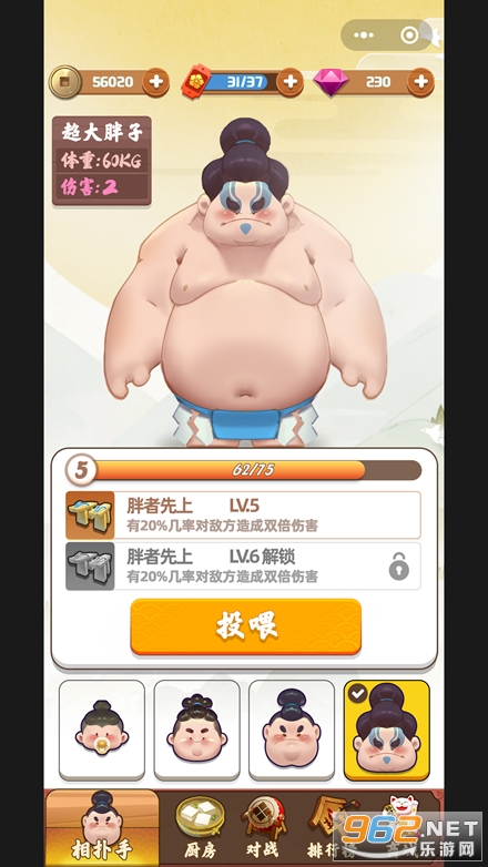 《谁胖谁先上最新版》是一款很魔性的对抗pk游戏,游戏中玩家要手持一把长杆与肥胖的相扑选手对决,灵活的利用你的武器,将你的对手ko,获得胜利和奖励,提高你的角色素质,增强战力。