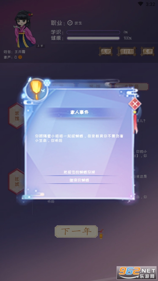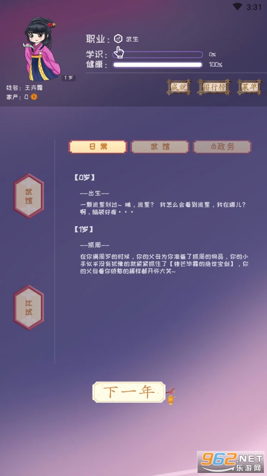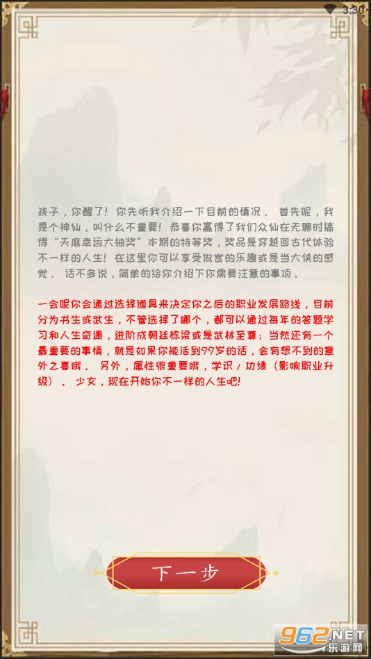 趣味的答题冒险游戏,玩家可以选择做官还是做大侠,有着众多的题目可以做答,注意不同的回答会有着不同的结果,会增长或者减少一些对应的属性,喜欢的朋友可以下载试试。