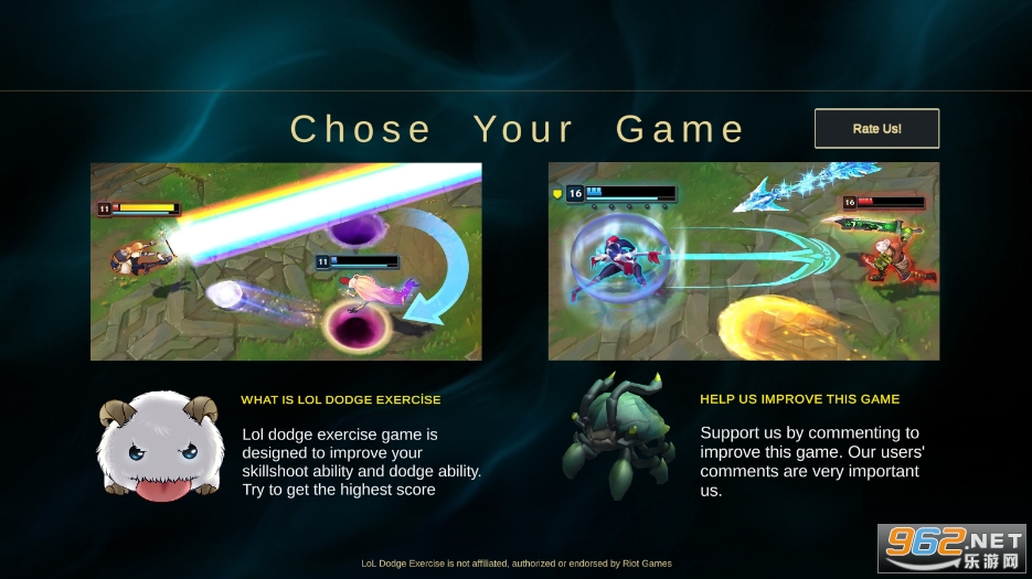 以LOL为核心打造,玩家在游戏中能够自己躲避各种技能伤害,选择你喜欢的英雄!