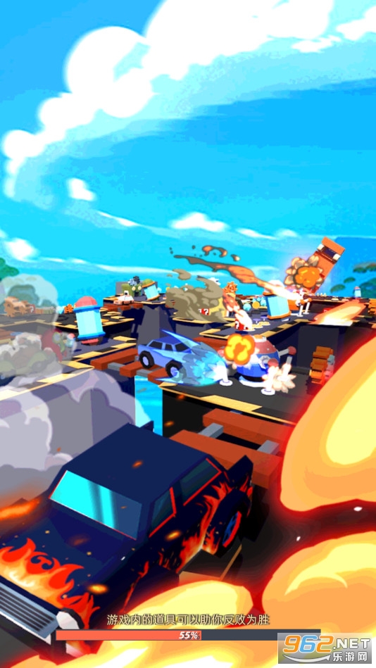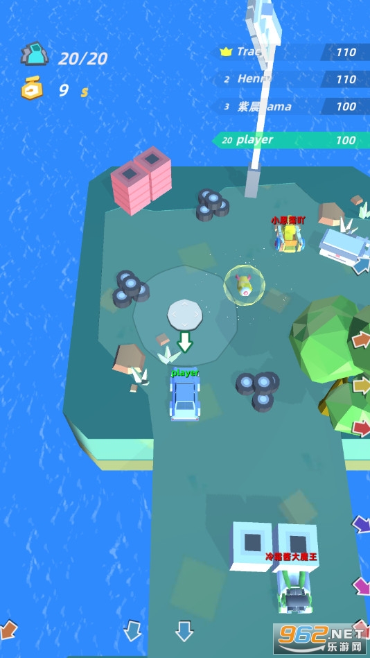 类似碰碰车的游戏,控制小车去撞击其他的汽车,将其撞出平台,可以收集道具,利用导弹等道具来更好的击败对手,存活到最后,喜欢的朋友可以下载试试。