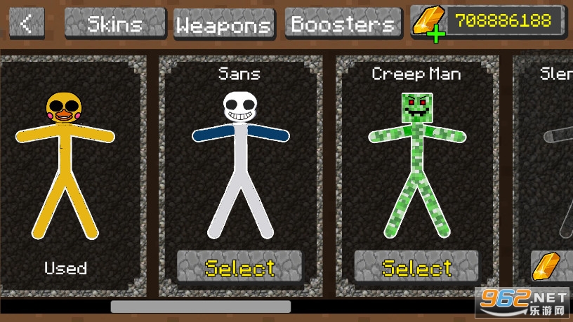 简约的像素火柴人游戏画面,简单的虚拟按键操作,轻松上手,不是很难,游戏有很多的皮肤可以解锁,只要你有足够的金砖