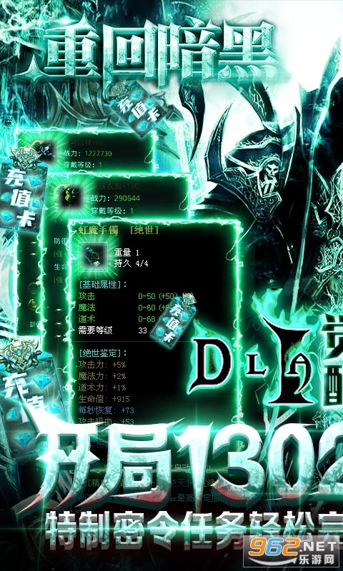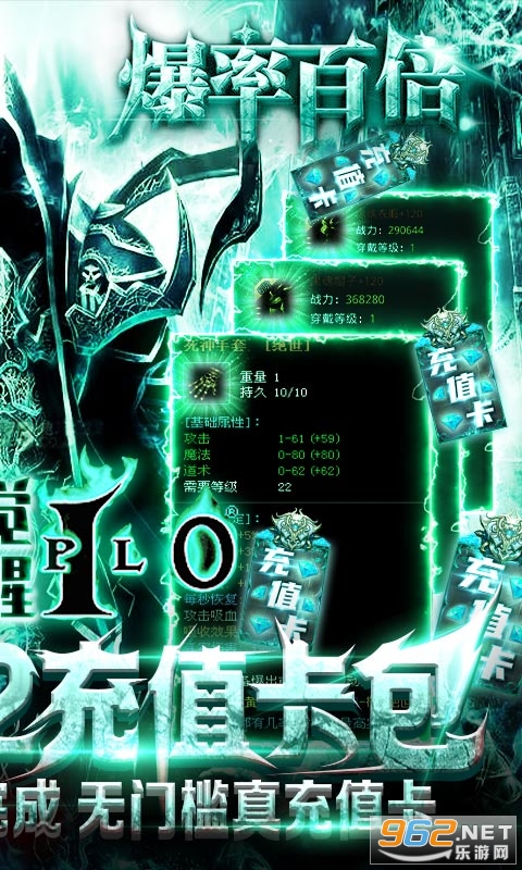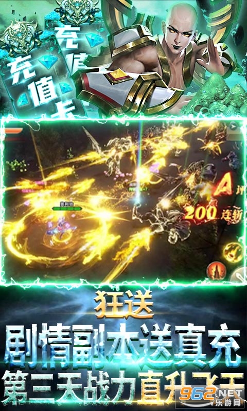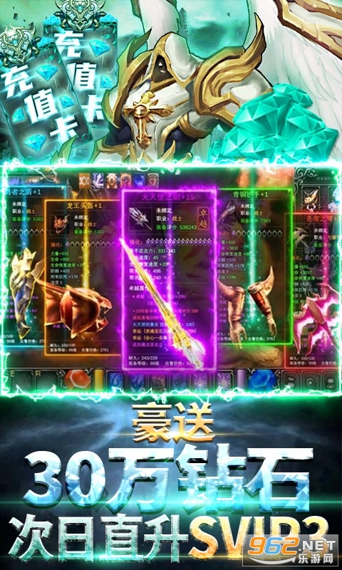 1、游戏福利少?该款游戏直接送1000元充值卡组,上线即可使用30元真钻卡获得300000充钻,VIP22、新手称号、极品神兵!