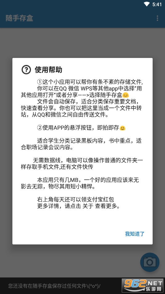 《随手存盒最新版》是一款为朋友们打造的一键管理、qq、钉钉、百度云等接受文件的软件,我们在用qq、或者百度云接收一些文件的时候如果要在手机上查找是需要比较繁琐的目录查找的,可以使用本款软件来一键找到自己接收到的文件,简单方便。