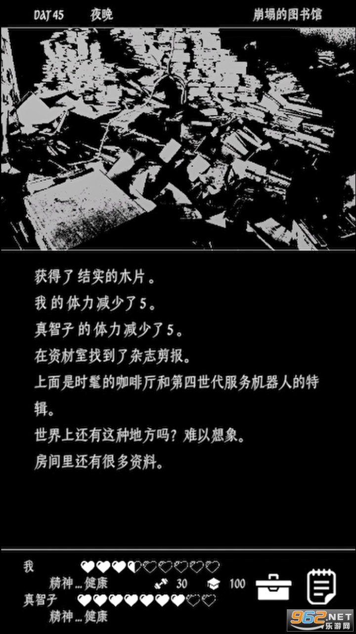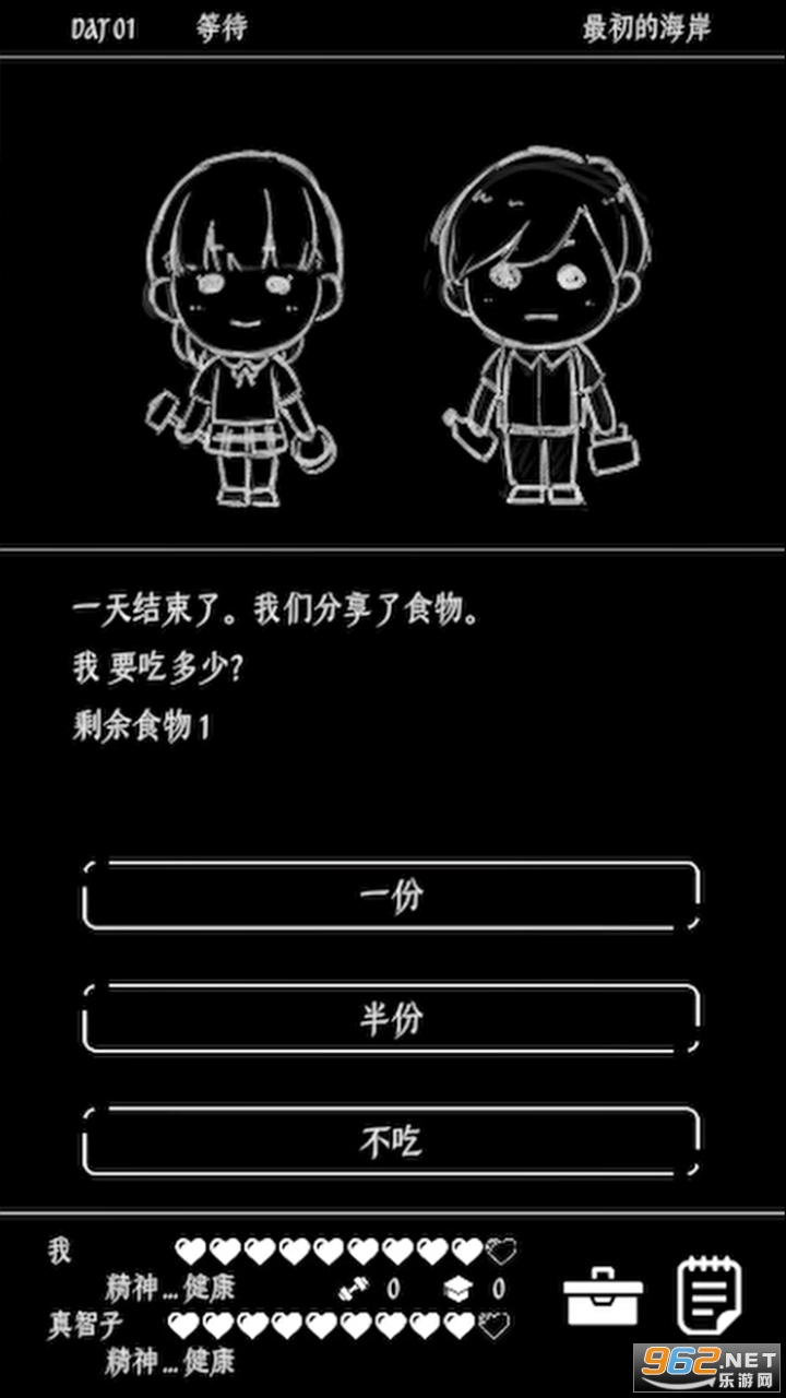 黑白风文字末日生存游戏,玩家需要帮助一男一女两个人在这个末世努力生存,寻找食物资源等,补充能量,保持人物的健康值和精神值,有着多种结局可以体验,喜欢的朋友可以下载试试。