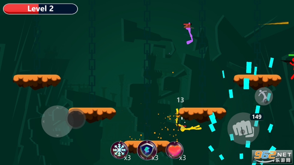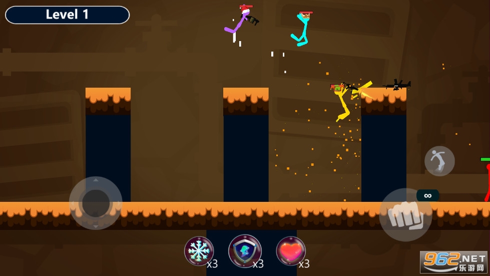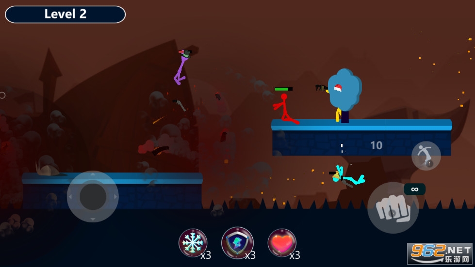 1:游戏中你可以选择不同的火柴人和很多的火柴人开始全新的乱斗之旅,游戏操作比较简单,还有很多道具和不同的场景,你都可以轻松的体验。