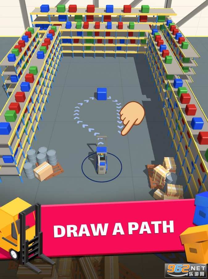 《叉车谜题 Forking Hell》中,玩家只需要用一根手指,画一条路,引导叉车避开周围的障碍物,并成功接到货物,送至传送带,完成关卡。