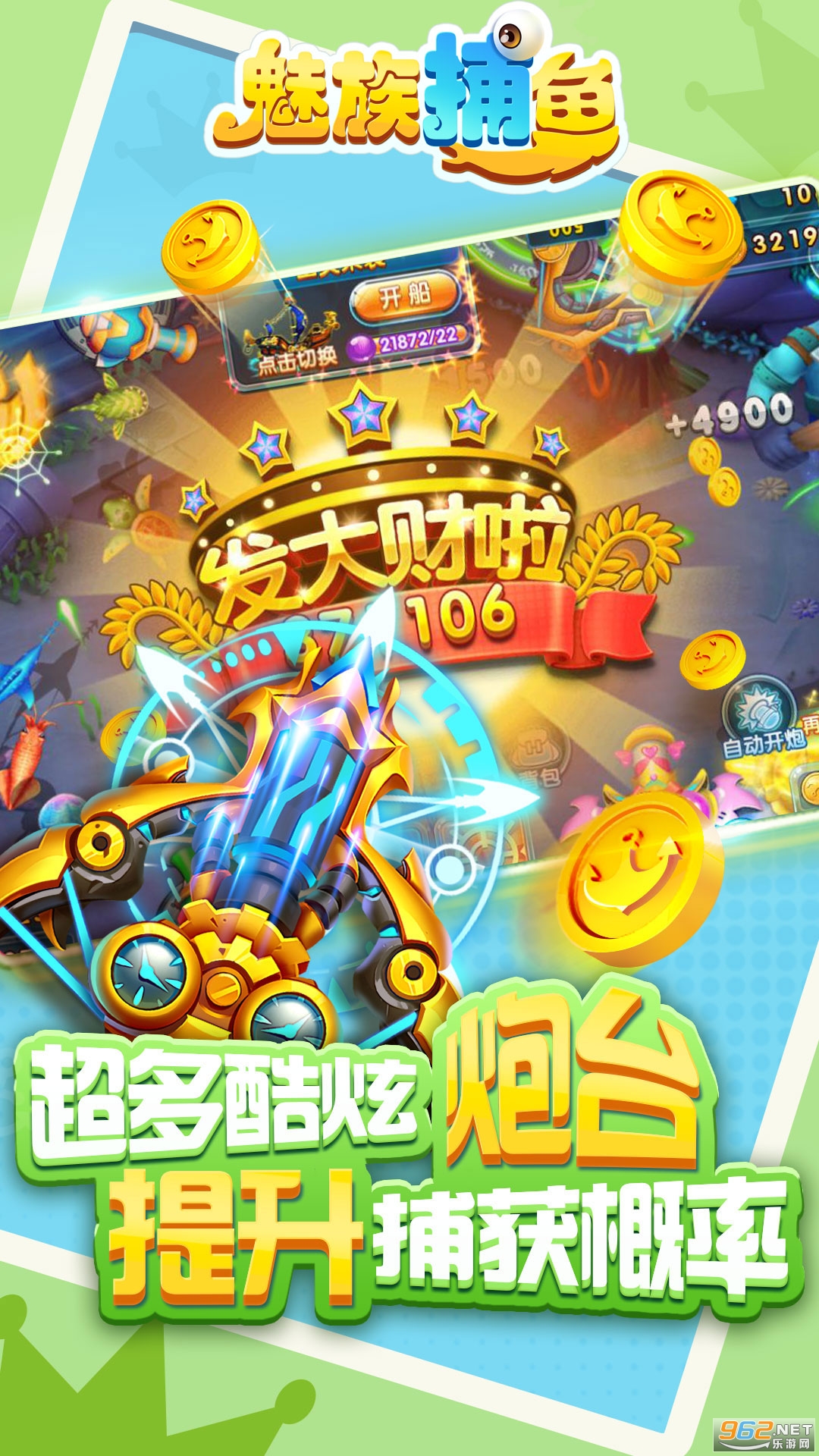 千炮只是起步,万炮不是终点!捕鱼玩法大升级!全网独创炮灵系统,给您的炮台加农炮!酷炫特效,万倍收益让您一炮亿金发大财!