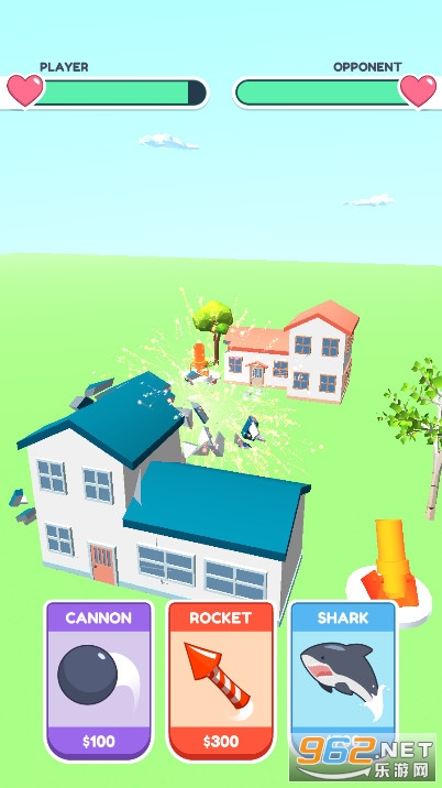 《砸爆邻居家安卓版》是一款很有意思的破怀游戏,游戏采用的回合制玩法,你的破坏工具有炮弹,火箭筒,鲨鱼,在你的武器发射出去后,你要控制好它的方向,让你的鲨鱼等等能冲向对手的屋子,将它的屋子砸毁,谁的屋子先被破坏玩,谁就输掉比赛。