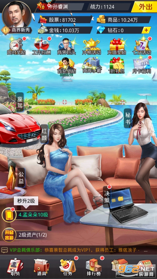趣味的经商游戏,玩家将成为老板经营自己的公司,你有这漂亮的秘书,可以招纳人才为自己打理公司,不断的提升资产,成为顶级富豪,游戏还有着红颜系统,与众多的美女约会,喜欢的朋友可以下载试试。