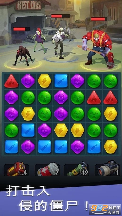 2、三消玩法集合战斗系统,帮助英雄打败丧尸,可以解锁角色隐藏技能。