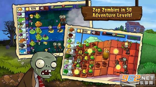 多达50个的冒险模式关卡设定,从白天到夜晚,从房顶到游泳池,场景变化多样!