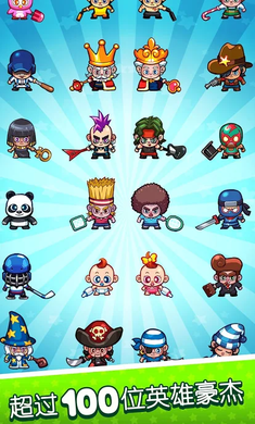 游戏采用了一种非常简单的操控模式来确保任何人都可以轻易上手。玩家绝对不需经过复杂又烦人的教学模式就可以完全享受游戏给您带来的乐趣。超过一百位英雄豪杰可以被解锁,而且每一位都具有独特的设计与特效。五种独特的强化技能来提高游戏的变化性。保证您百玩不腻。