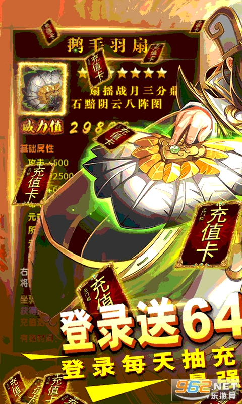 ★后缀说明:每天登陆领充值卡,登陆7天可一共可领取648充值卡,使用充值卡可以获取对应额度的钻石,每天登陆玩家可以免费抽充值卡,抽上将令(上将令可抽稀有武将)