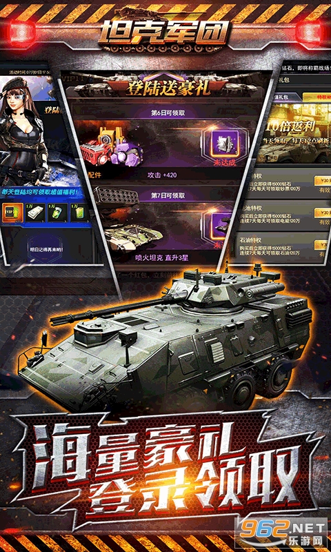 3.次日登录领取稀有战车:喷火坦克,战斗力直线飚升!势均力敌,谁与争锋,看谁才是真正的王牌!