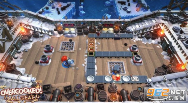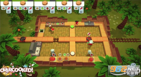 2、游戏中玩家可以穿越地形将食材直接投掷到队友手里、砧板上或者锅里;