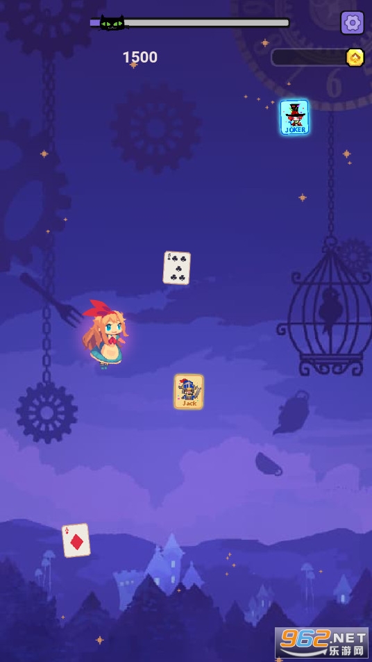 在这里,爱丽丝可以踩着各种各样的卡牌不断攀登在神秘的星空里,当然她不是一个人在战斗,柴郡猫,疯帽匠,卡牌国王和王后,都会以各种形式出现在她的旅途中~ 随着爱丽丝跳跃高度的增加,还会陆续解锁各种新的服装哦~