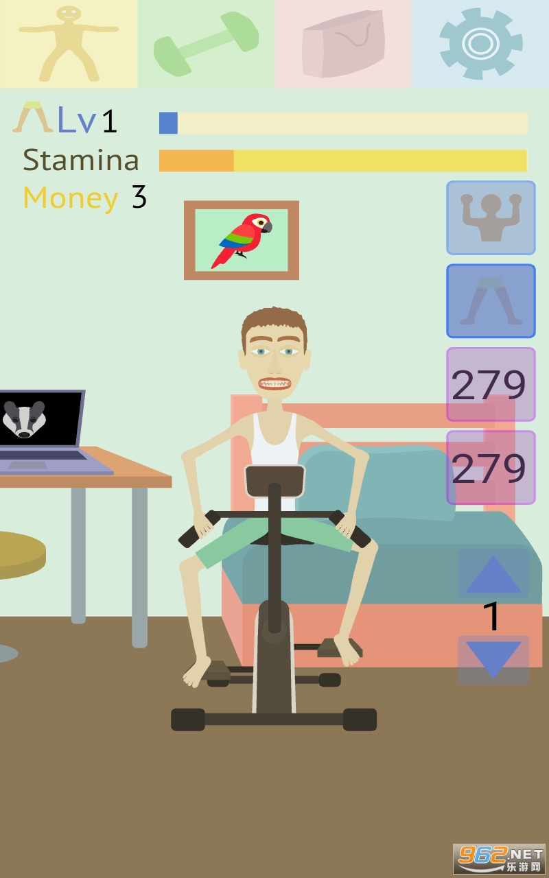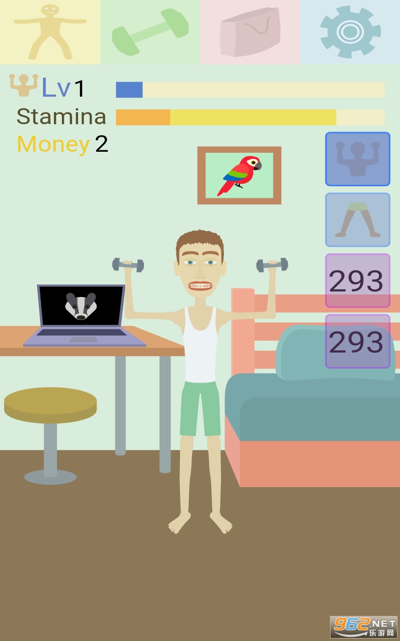 用新的哑铃和健身自行车来锻炼,以获得更多的经验和金钱。