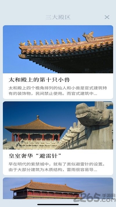 软件以故宫建筑文化为主题,每个界面都精美绝伦,主打紫禁城结构和历史学习记录,在这里有很多的建造文化知识,可以让用户了解到每一座宫殿的历史,还有各种的小细节、动画效果,都让人觉得心旷神怡,带你全面了解紫禁城的历史!